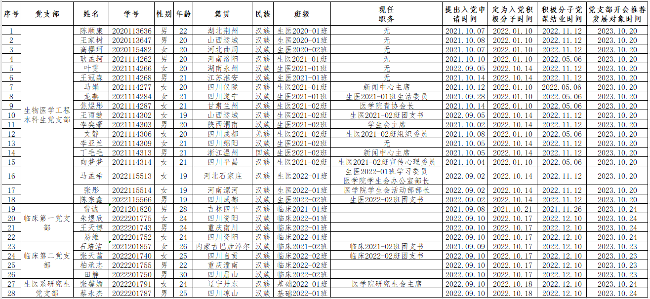 经班团组织推优、群众意见征集、党支部委员会/党员大会讨论,现将医学院党委2023年第二批发展对象预备人选名单公示如下: