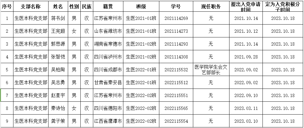现将医学院党委2023年秋季学期入党积极分子名单公示如下,公示期10月25日-10月29日,如有异议请以书面形式将意见反馈至医学院X2414办公室。