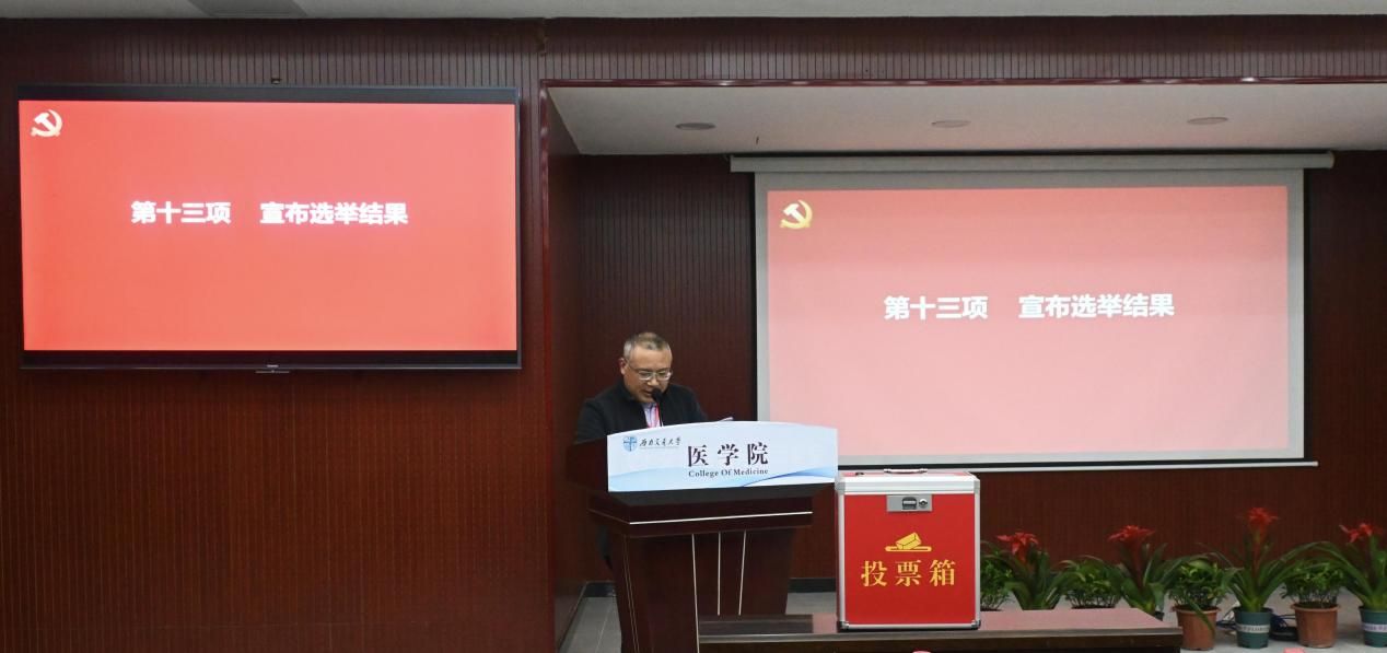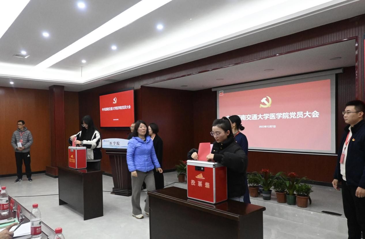 大会选举阶段,按照组织程序,在总监票人李孝红同志的主持下,与会的有选举权的党员同志们投下了庄严的选票。经选举,李锦红、冷永祥、于楠、向韬、芦莹华5位同志当选中国共产党西南交通大学医学院新一届委员会委员;于楠、蔡俊俊、郑晓彤3位同志当选中国共产党西南交通大学医学院新一届纪律检查委员会委员 。