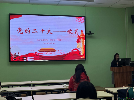根据《医学院2022年度基层党支部组织生活会及民主评议党员工作方案》相关安排,临床第一党支部于2023年3月9日11:00在成都市第三人民医院102教室召开了党的二十大精神专题学习会。本次学习由李傲霜同志领学,学习主题为“党的二十大——教育”,党支部全体党员参加。