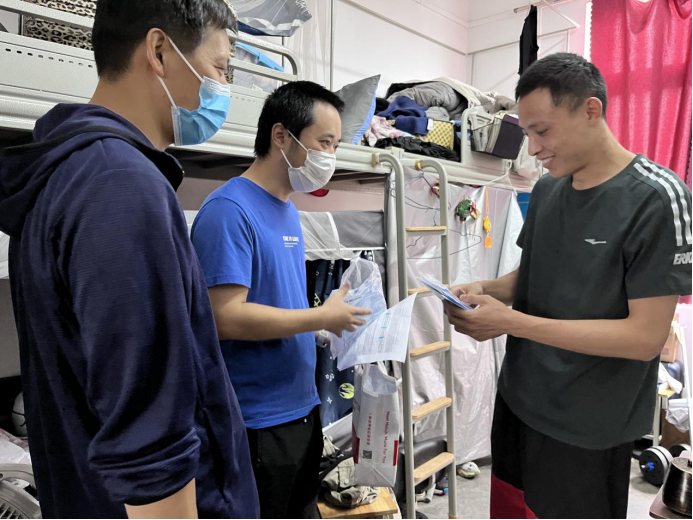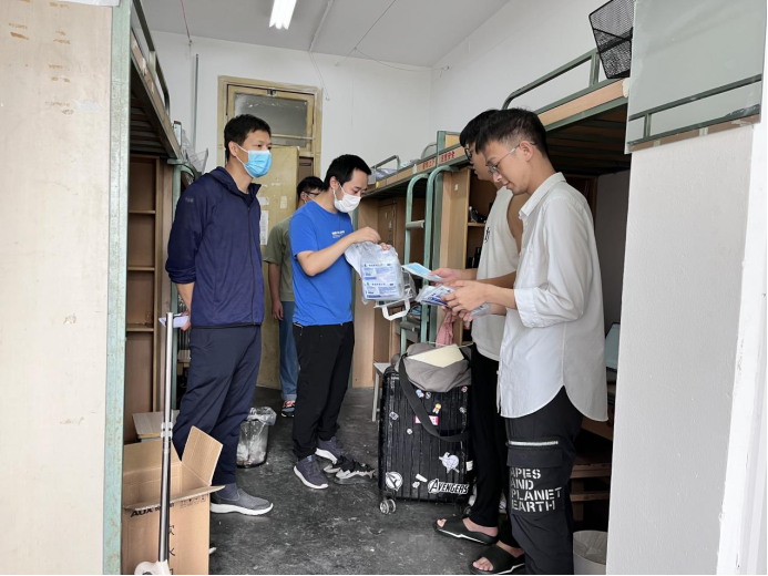 9月2日下午,医学院党委书记李锦红、学生工作组副组长胡豪、辅导员黄雪梅及高年级学生代表共同走访学生宿舍,给同学们发放防疫物资。医学院党委书记李锦红亲切与同学们进行交谈,深入了解静态管理期间同学们学习和生活情况,包括生活物资是否充足、就餐有无困难,以及当前因疫情防控要求暂停外出实验对科研进度的影响等,充分了解学生诉求,收集学生意见以全力保障同学们的正常生活。此外,李书记也给同学们加油打气,安慰同学们疫情只是短暂的,切勿产生负面消极情绪,要积极调整心态,放松心情,多与同学或老师交流,只要大家同心抗“疫”,共克时艰,严格遵守防疫政策,理解与支持学校防疫工作,疫情终将过去,很快将迎来“抗疫”胜利的曙光!