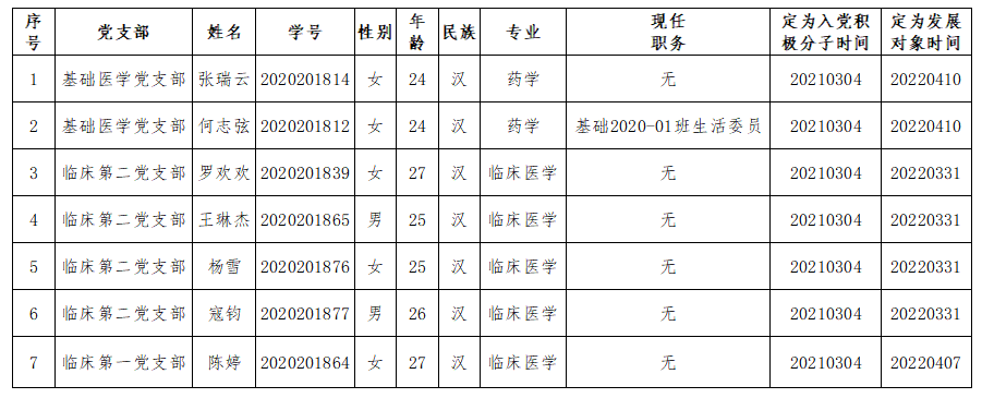 经群众意见征集、党支部委员会讨论、医学院党委备案,现将医学院党委2022年第一批发展对象名单公示如下: