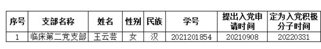 经学生本人递交入党申请书、党组织考察谈话、团支部推优或党员推荐、党支部委员会会议研究决定,现将医学院党委2022年第一批入党积极分子名单公示如下,公示期4月11日-4月15日,如有异议请以书面形式将意见反馈至医学院A209办公室蔡老师处。