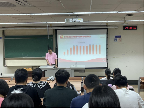 李锦红书记从一张中国的人均预期寿命发展趋势图引入,讲述了我国自新中国成立以来在卫生健康事业方面的发展变化。从新中国成立初期的传染病横行、人均寿命仅35岁,到现在建立起了世界上规模最大的基本医疗保障网,在全球的新冠疫情防控战中也展现出了非凡的大国实力,建立“健康中国”,党和国家在这百年间在卫生健康领域取得了显著的成就,中华民族实现了从“东亚病夫”到“东方巨人”的伟大转变。
