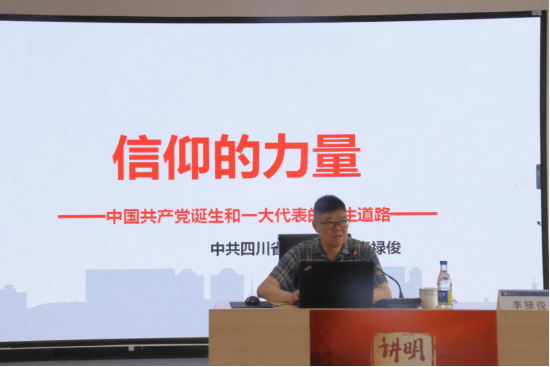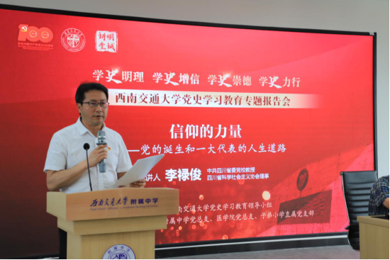 为庆祝中国共产党成立100周年,扎实推进党史学习教育走深走实,稳步推动思想政治教育入脑入心,5月20日下午,西南交通大学“明诚讲堂”党史学习教育系列专题报告会第三讲在附属中学多功能厅开讲。中共四川省委党校教授、四川省科学社会主义协会理事李禄俊教授做专题报告。西南交通大学附属中学党总支书记朱剑松、副书记魏明德、副校长董鑫、副校长曾俊,医学院党总支书记李锦红,子弟小学校长王利琨,以及附属中学党总支、医学院党总支、子弟小学直属党支部师生党员代表参加了本次报告会。报告会由附属中学党总支副书记魏明德主持。