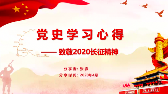 本次读书会上,张淼同志以PPT的形式分享了《中国共产党历史 第一卷》中关于红军长征的内容,并结合新型冠状病毒事件,致敬2020年疫情攻坚战中的“长征精神”。中国工农红军长征是人类历史上的伟大奇迹,历时两年,经过14个省,翻越18座大山,跨过24条大河,走过荒草地,翻过雪山,行程约二万五千里,这是一场关键的战略转移行动;长征的胜利使中国共产党有了稳固的革命根据地,使抗日战争、解放战争有了稳固的后方。长征是宣言书,它向全中国和全世界宣告,中国共产党及其领导的人民军队是一支不可战胜的力量;其铸就的伟大长征精神,是中国共产党人和人民军队革命风范的生动反映,是中华民族百折不挠、自强不息的民族精神的最高表现,是保证我们革命和建设事业走向胜利的强大精神力量。